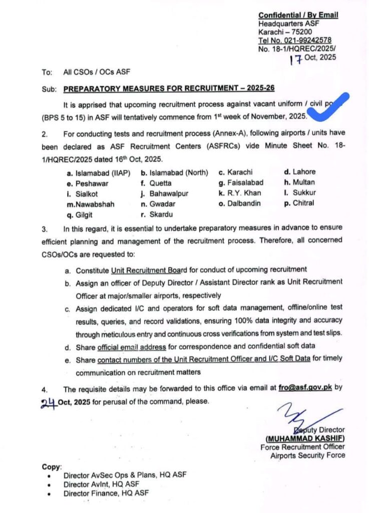 To facilitate a smooth process, ASF has designated 18 Recruitment Centers (ASFRCs) at major airports and units (Annex-A). All Chief Security Officers (CSOs) and Officer Commanding (OCs) are directed to implement preparatory measures by October 24, 2025, including constituting Unit Recruitment Boards and assigning dedicated personnel for data management and communication.