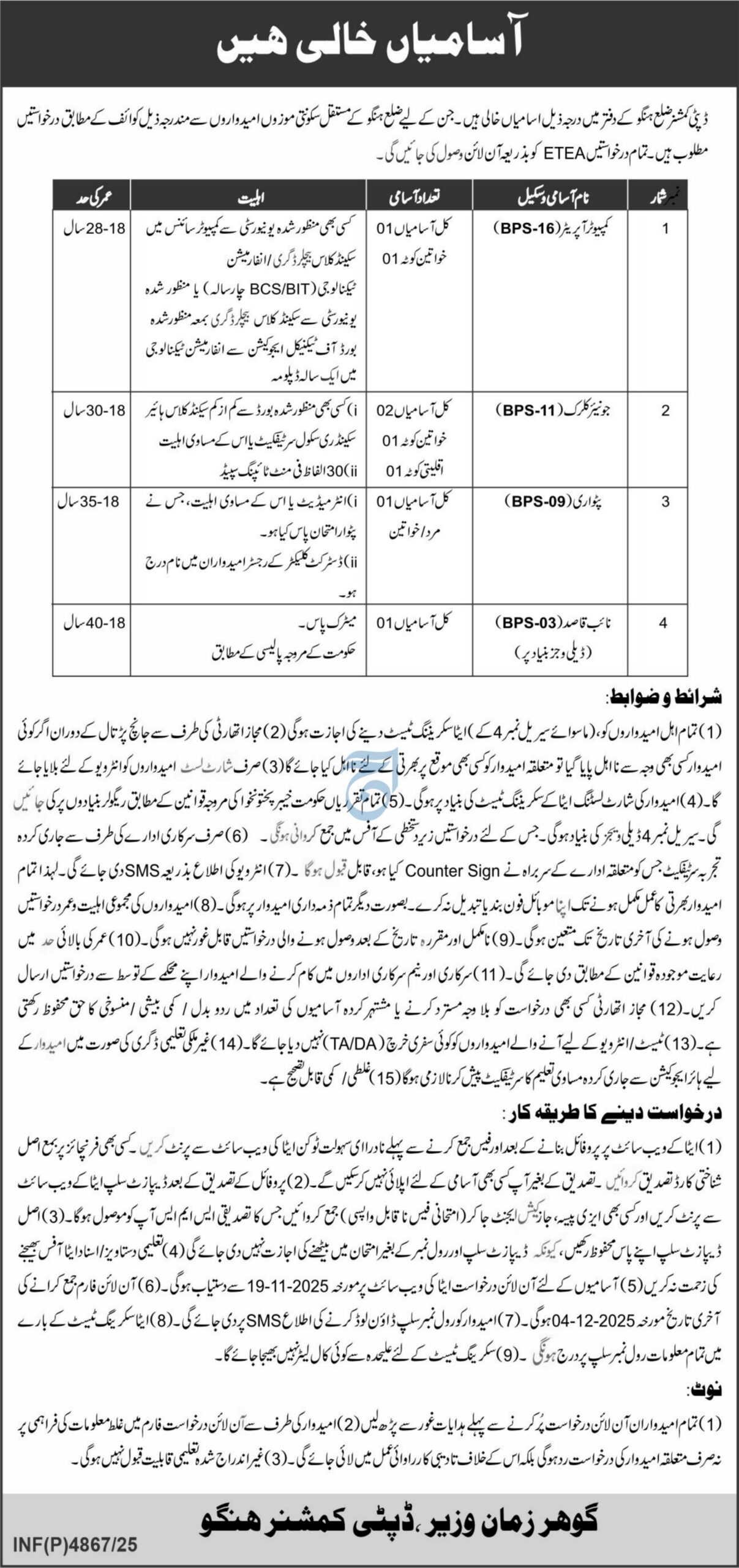The Deputy Commissioner Office invites applications from eligible candidates for the posts of Naib Qasid, Computer Operator, Patwari, and Clerk as per the advertisement published in daily Aaj Newspaper on November 20, 2025. Candidates with educational backgrounds such as Primary, Middle, Matric, and Intermediate and relevant skills are highly encouraged to apply for these government management and administrative positions.