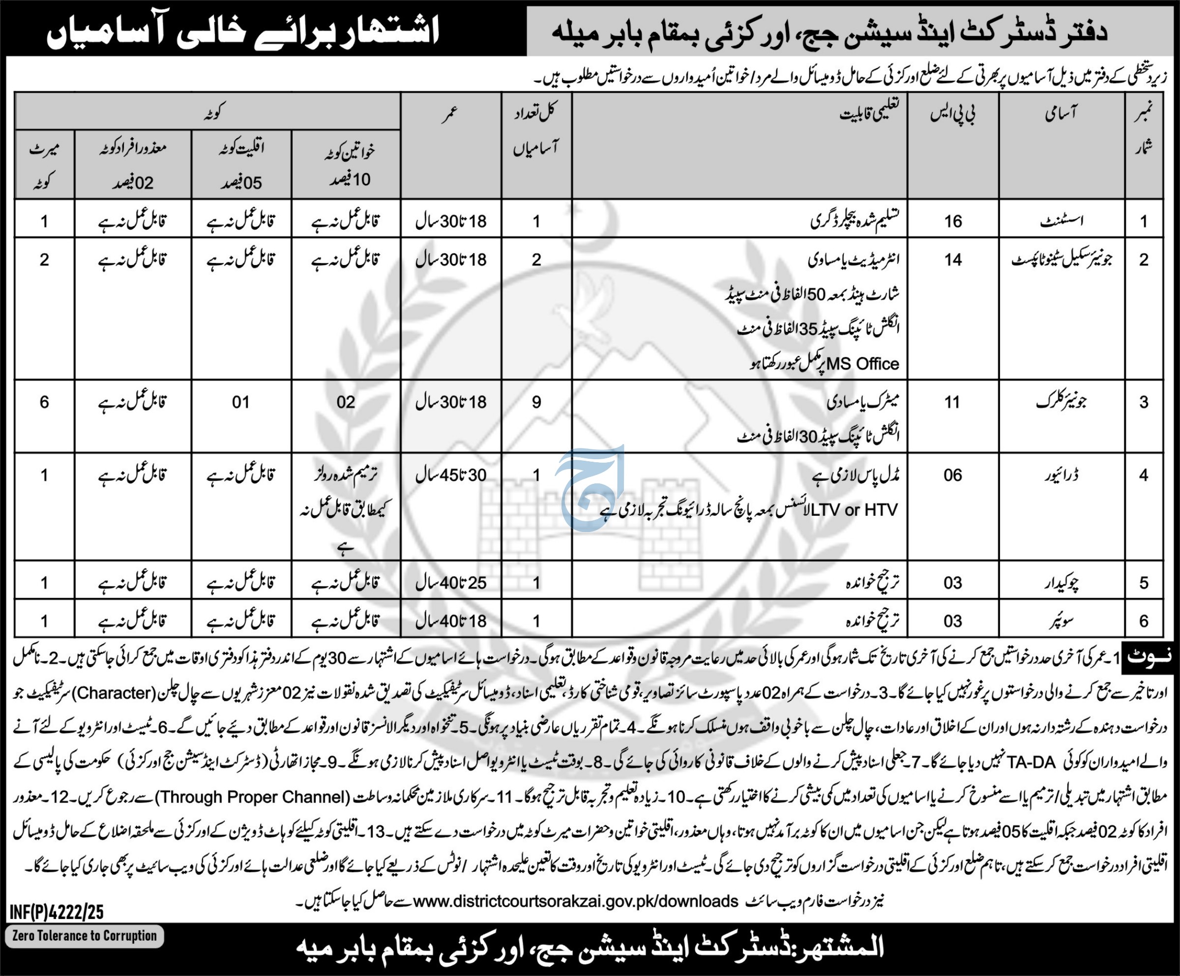 District & Session Court Latest Jobs Advertisement 2025 BPS-03 TO BPS-16