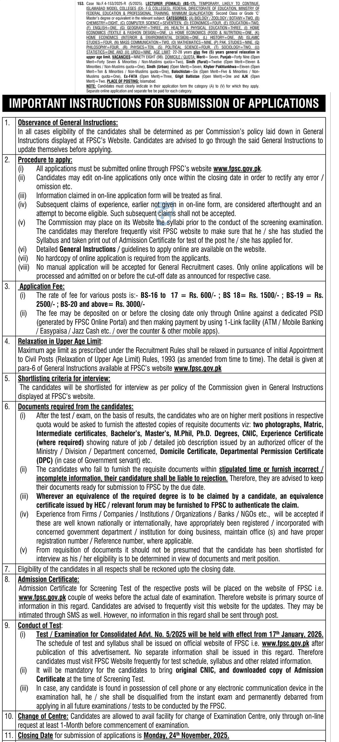 • Apply as per instructions provided in FPSC Advertisement No. 5/2025 dated November 13, 2025.