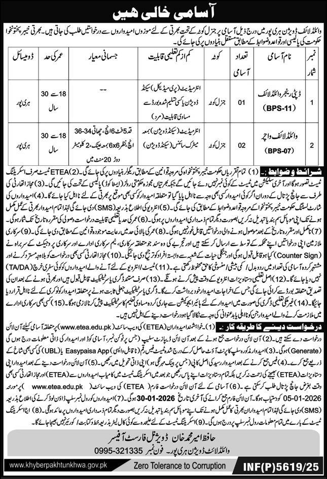 The latest Government jobs in Human Resource and others at the Forest & Wildlife Department can be applied for until January 30, 2026 or as per the closing date in the official newspaper advertisement. Applications are to be submitted through ETEA.