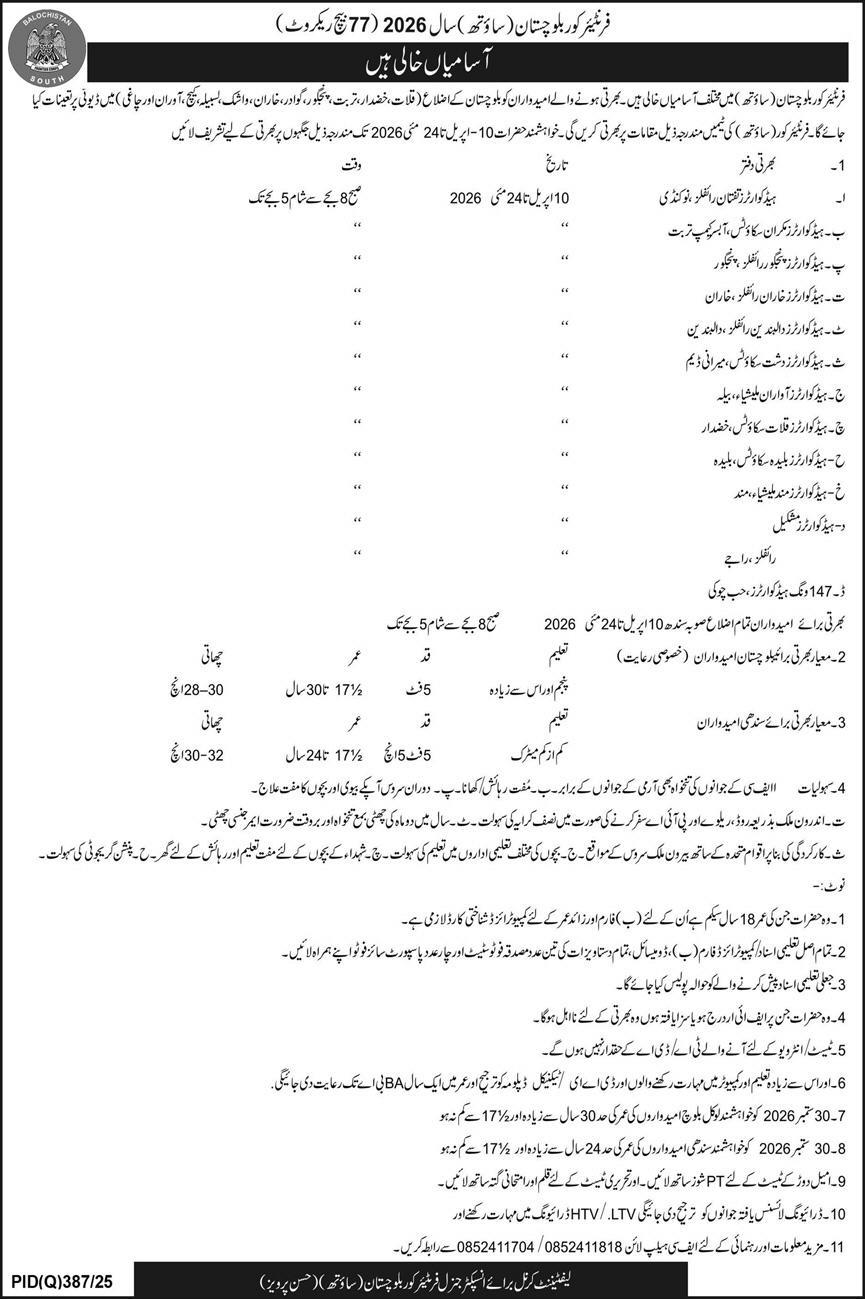 Frontier Corps (FC) has announced new government job opportunities through an advertisement published on 28 March 2026 in the Daily Express Newspaper. These vacancies provide excellent career opportunities for individuals seeking employment in the defense and security sector of Pakistan.