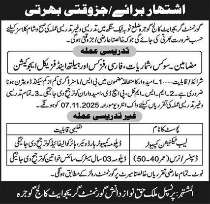 Government Graduate College Gojra, a prominent educational institution in Toba Tek Singh, Punjab, is inviting applications for diverse teaching and support roles, including Lecturer Statistics, Dispenser, Lecturer Persian, Teacher, Lab Technician, Lecturer, Lecturer Physics, Lecturer Civics, and Lecturer Health Physical Education and Nurse, as featured in the November 5, 2025, edition of daily Express Newspaper. These positions suit candidates with qualifications ranging from Matric to PhD, such as Master, MS, MPhil, Bachelor, Intermediate, DAE, and others.