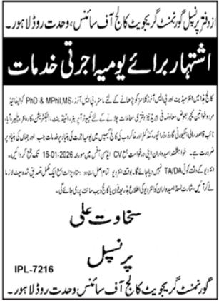 The latest Government Education jobs at Government Graduate College of Science can be applied for until January 15, 2026 or as mentioned in the official newspaper advertisement. Applicants should refer to the full ad for complete guidelines and eligibility details.