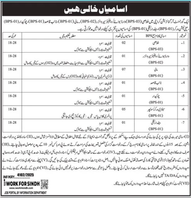 A Government Organization has announced multiple vacancies as per the job advertisement published in the daily Jang Newspaper on December 6, 2025. Available positions include Khalasi, Beldar, Sanitary Worker, Sweeper, Ward Boy, Naib Qasid, Welfare Supervisor, Coolie, Chowkidar, and Mali. Candidates with educational backgrounds such as Intermediate, Matric, and Primary and others are highly encouraged to apply for these government labor and support department positions in Karachi, Sindh, Pakistan.