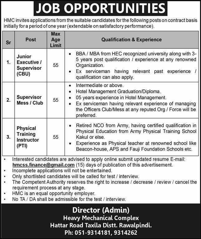 • Contact: Director (Admin), Heavy Mechanical Complex, Hattar Road Taxila Distt. Rawalpindi. Ph: 051-9314181, 9314262.