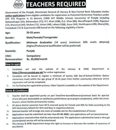 Literacy & Non-Formal Education Department Teachers Jobs 2026 Apply Online