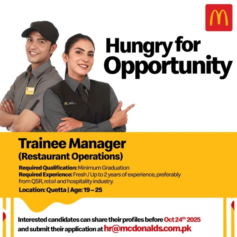 McDonald’s Pakistan, the global leader in quick-service restaurants, is launching its Trainee Manager program to develop future restaurant leaders! The McDonald’s Jobs 2025 announcement invites fresh graduates and early-career professionals for the position of Trainee Manager (Restaurant Operations) in Quetta. Applications must be submitted by October 24, 2025, offering an exciting entry into the world’s most iconic fast-food brand.