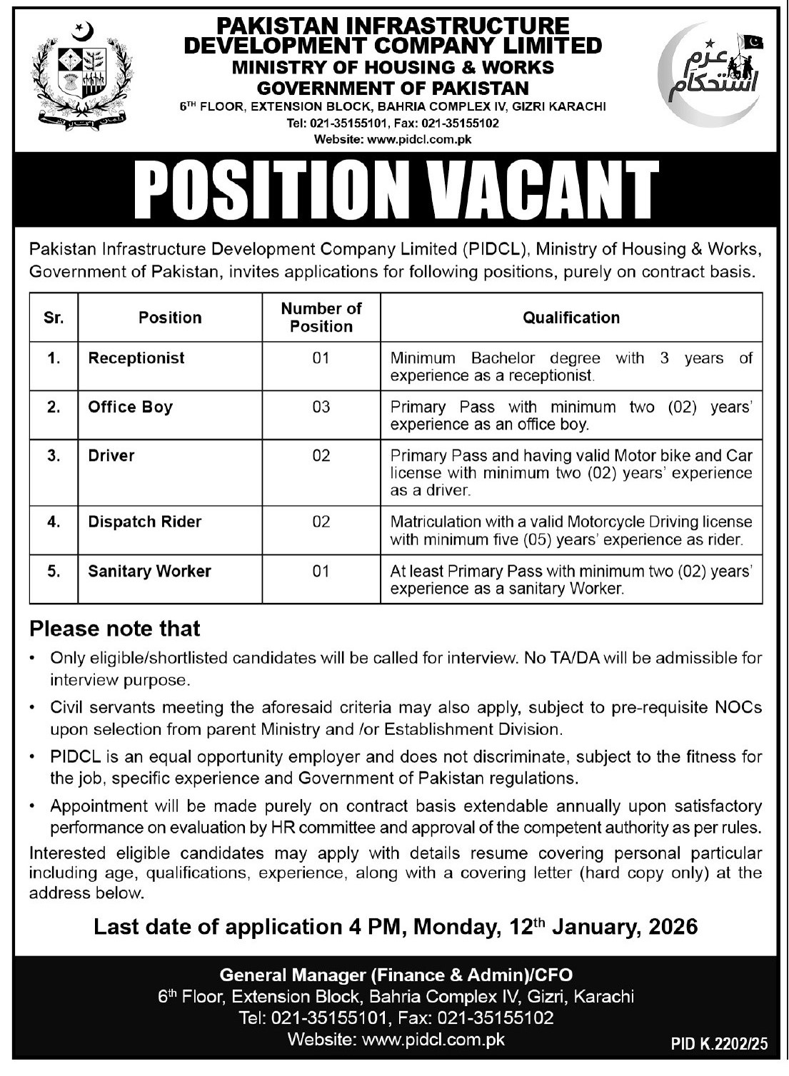 The Ministry of Housing and Works is looking for candidates for multiple posts as per the job advertisement published in daily Express Tribune Newspaper on December 26, 2025 for location Karachi, Karachi Sindh Pakistan. Available positions include Receptionist, Sanitary Worker, Driver, Dispatch Rider and Office Boy. Candidates with educational backgrounds such as Middle, Primary and Matric etc. will be preferred.