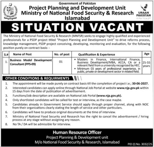 Ministry of National Food Security & Research MNFSR Jobs 2025 Advertisement