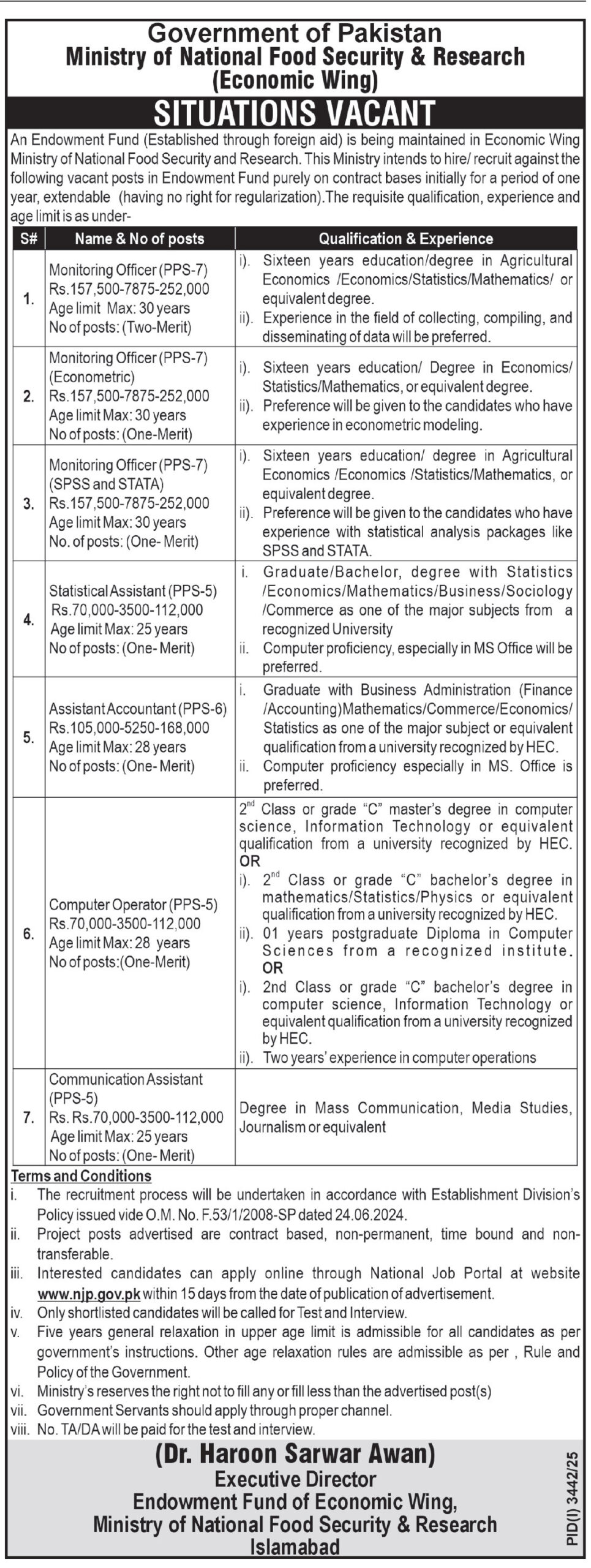 Ministry of National Food Security & Research MNFSR Jobs 2025 Advertisement