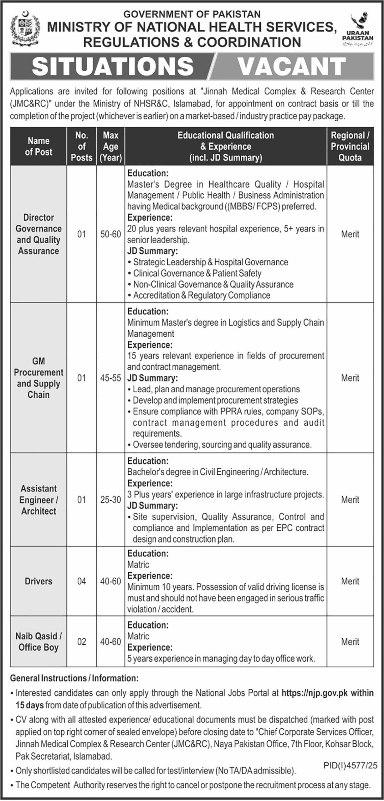 The Ministry of National Health Services Regulations & Coordination (NHSRC) Islamabad has announced multiple vacancies as per the job advertisement published in the daily Other Newspaper on December 5, 2025. Available positions include Director Quality Assurance, Office Boy, Naib Qasid, Director Governance, Driver, Assistant Engineer, GM Procurement, GM Supply Chain, and Assistant Architect. Candidates with educational backgrounds such as Master, Bachelor, MS, Matric, and Middle and others are highly encouraged to apply for these government management and administrative department positions in Islamabad, Pakistan.