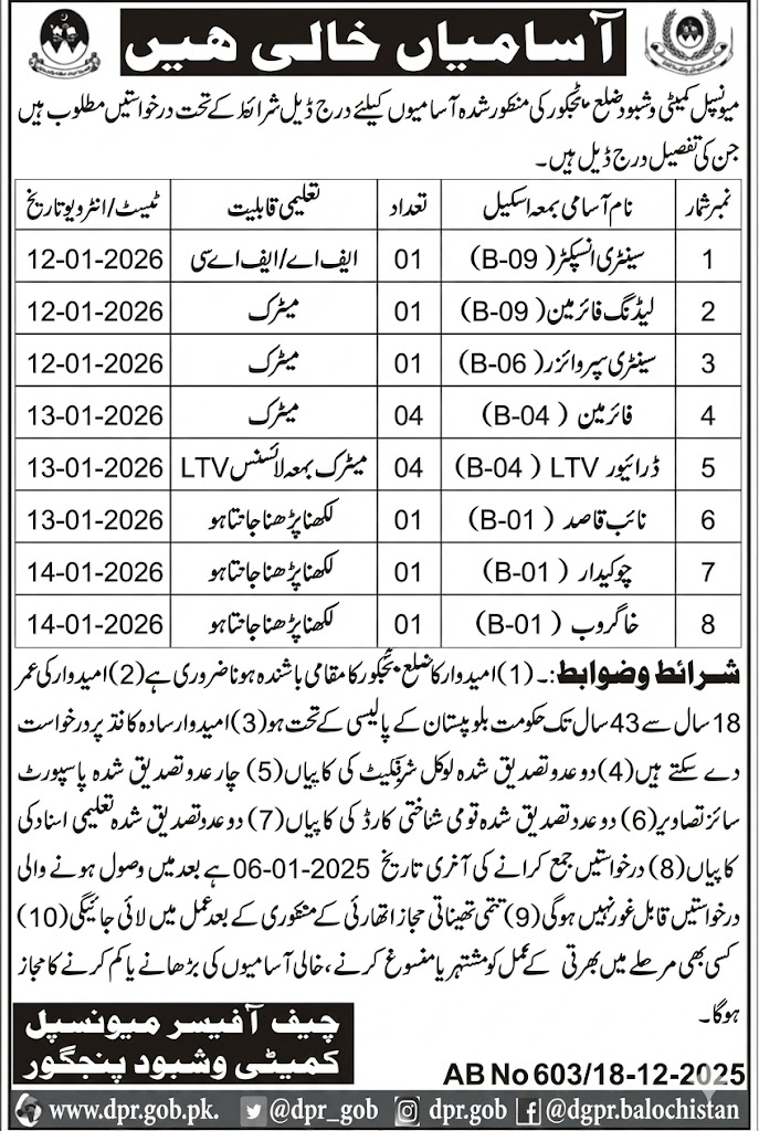 The Municipal Committee has announced multiple vacancies as per the job advertisement published in the daily Jang Newspaper on December 19, 2025. Available positions include Sanitary Supervisor, Sanitary Inspector, Leading Fireman, Chowkidar, Naib Qasid, Fireman, Driver LTV and Khakrob. Candidates with educational backgrounds such as Primary, Middle and Matric etc. are highly encouraged to apply for these government positions.