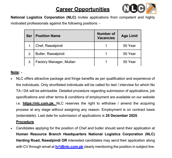 The latest Government Human Resource jobs at National Logistics Cell NLC can be applied for until December 31, 2025 or as mentioned in the official newspaper advertisement. Applicants should refer to the full ad for complete guidelines and eligibility details.