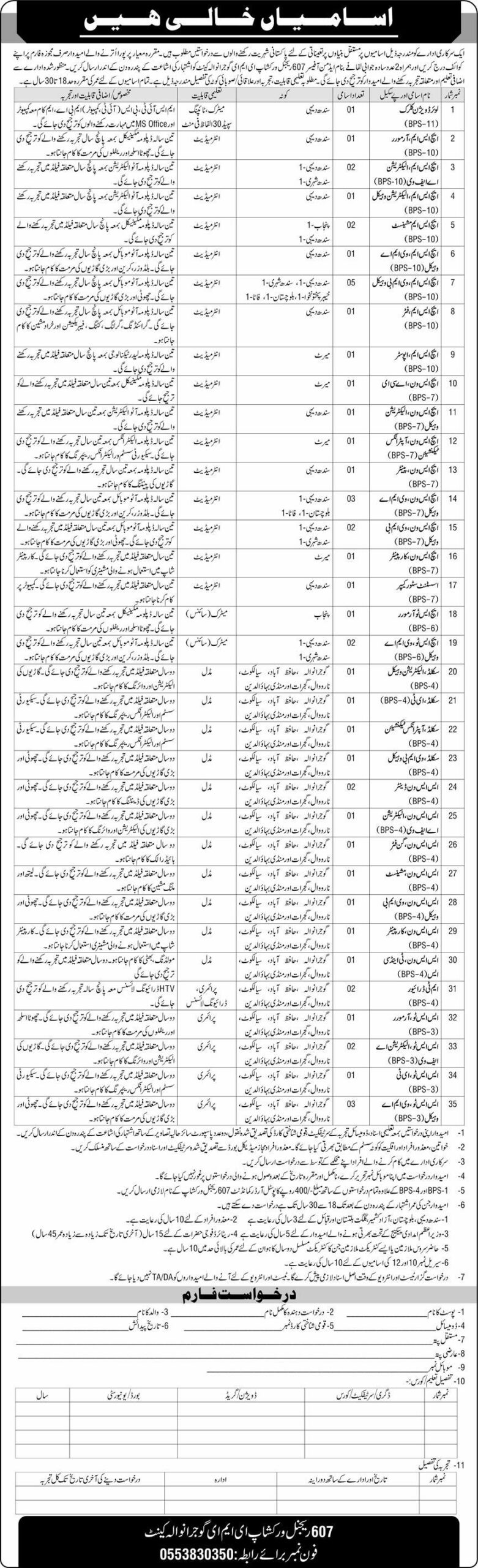 607 Regional Workshop EME, a Pakistan Army facility, is seeking skilled technicians, tradesmen, and support staff to support vehicle maintenance, electrical, mechanical, and administrative operations. Below are the details for the announced positions: