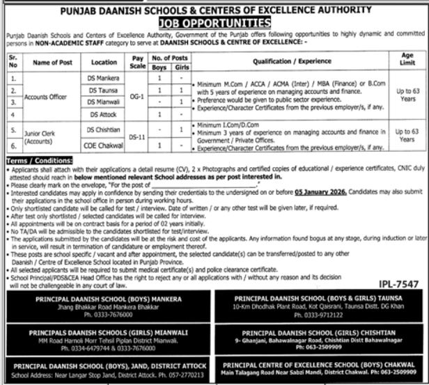 The Punjab Daanish Schools & Center Of Excellence Authority has announced multiple vacancies as per the job advertisement published in the daily Jang Newspaper on December 18, 2025. Available positions include Account Officer and Clerk. Candidates with educational backgrounds such as Bachelor, M.Com, MS, Intermediate, and Master and others are highly encouraged to apply for these government management department positions in Mianwali, Punjab, Pakistan.