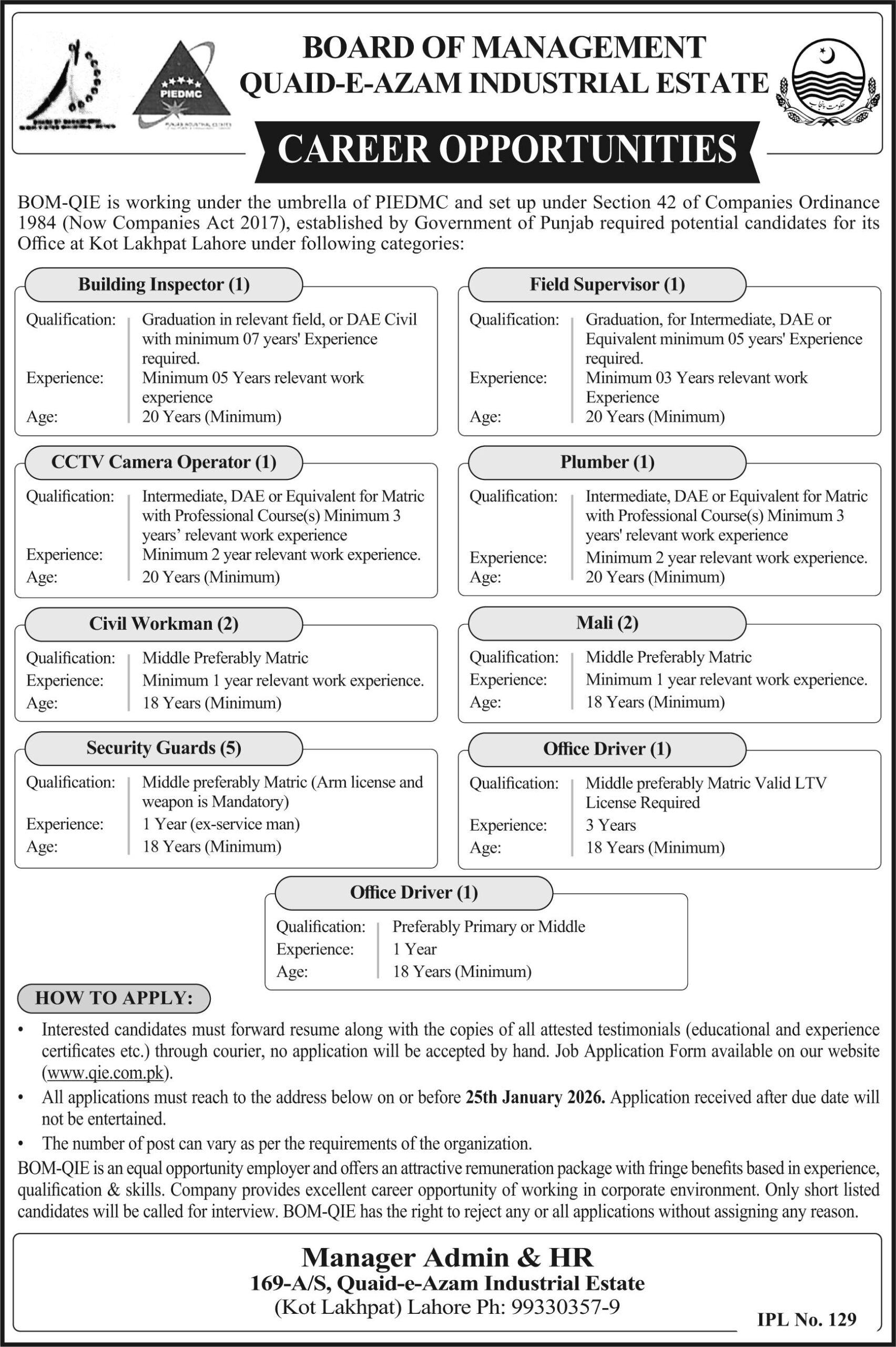 The Quaid e Azam Industrial Estate invites applications for multiple job positions as per the advertisement published in daily Other Newspaper on January 7, 2026 for location Lahore, Lahore Punjab Pakistan. Available positions include Building Inspector, Civil Workman, Field Supervisor, Security Guard, Mali, CCTV Camera Operator, Office Driver and Plumber. Educational qualifications required are Middle, Matric, Bachelor and Intermediate etc.