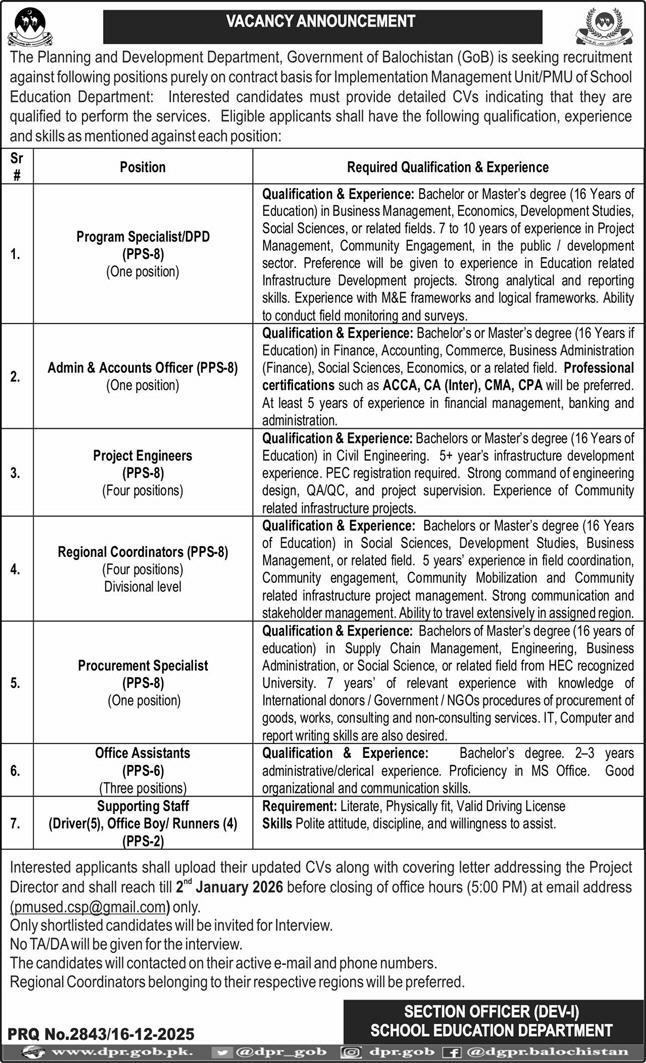 The School Education Department has announced multiple vacancies as per the job advertisement published in the daily Express Newspaper on December 17, 2025. Available positions include Runner, DPD, Civil Engineer, Project Engineer, Office Boy, Regional Coordinator, Driver, Supporting Staff, Program Specialist, Office Assistant, Admin Officer, Accounts Officer, and Procurement Specialist. Candidates with educational backgrounds such as B.E, Primary, CA, M.Sc, Others, Middle, ACCA, Bachelor, and Master and others are highly encouraged to apply for these government management department positions in Punjab, Pakistan.