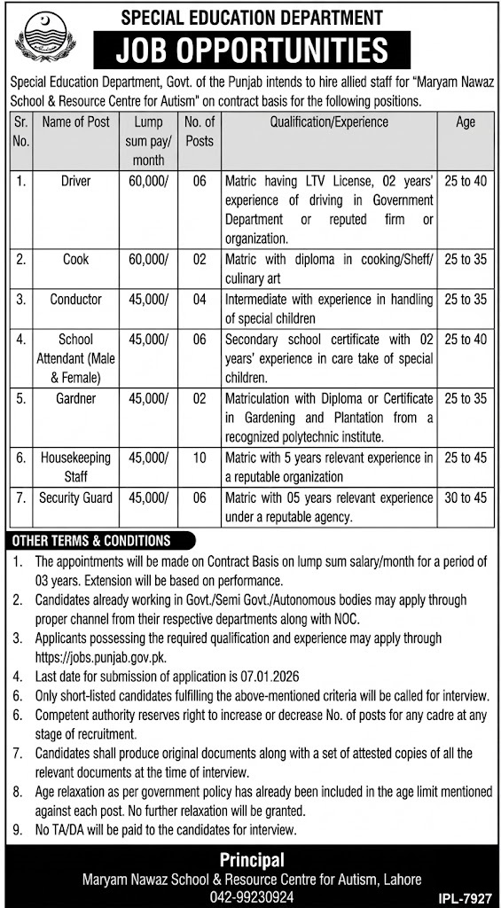 The Special Education Department Lahore is seeking dedicated candidates to support school operations, transportation, security, maintenance, and care services. Below are the details for the announced positions: