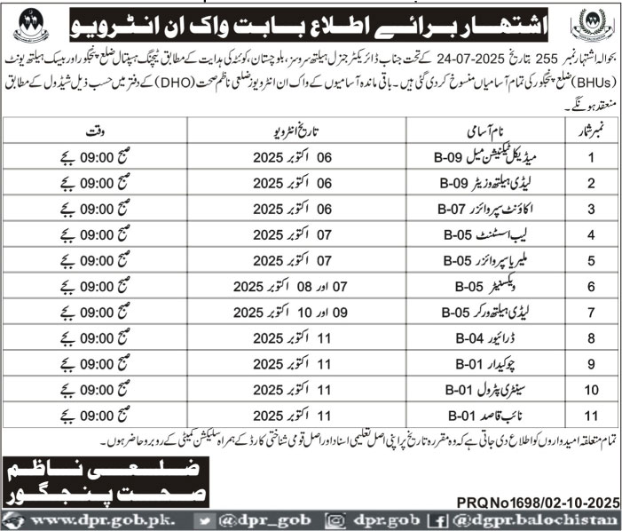 Candidates with local Panjgur domicile, higher education, or experience in health services will be prioritized in the selection.