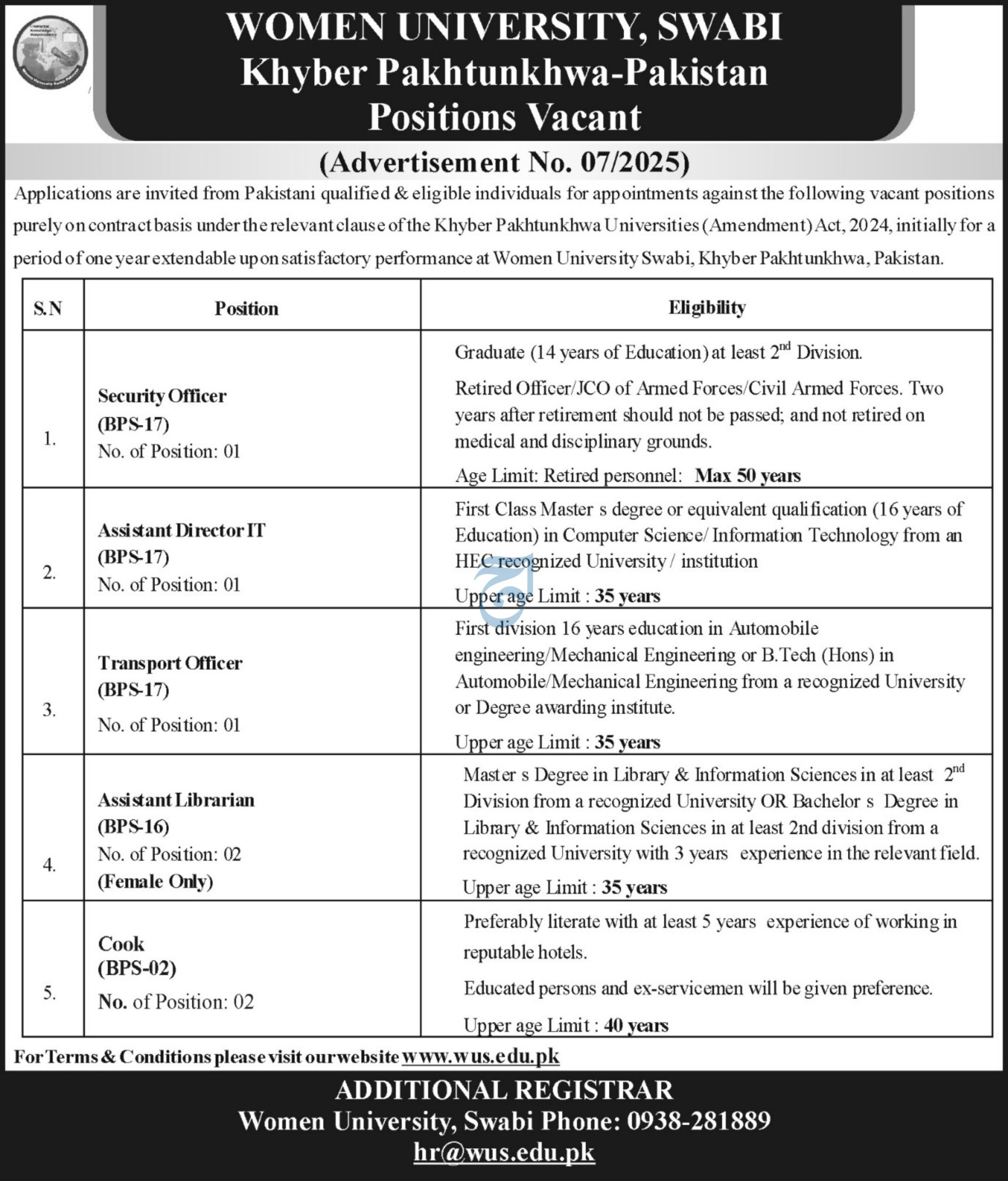 The Women University Swabi is seeking qualified candidates to support its administrative, library, transport, security, and IT operations. Below are the details for the announced positions: